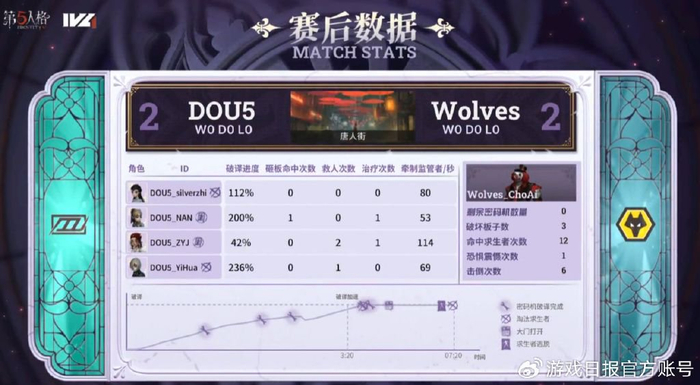 当比赛来到第三局决胜局时,气氛也变得逐渐紧张了起来。上半场DOU5战队继续选择监管者守夜人,首追对方勘探员 ,但Wolves战队却上演绝妙配合 ,Wolves_487勘探员通过精湛操作 ,牵制监管者长达178秒 ,中期求生者阵营稳定救援并抗伤成功保活队友 ,开门战默契配合最终完成四跑 。